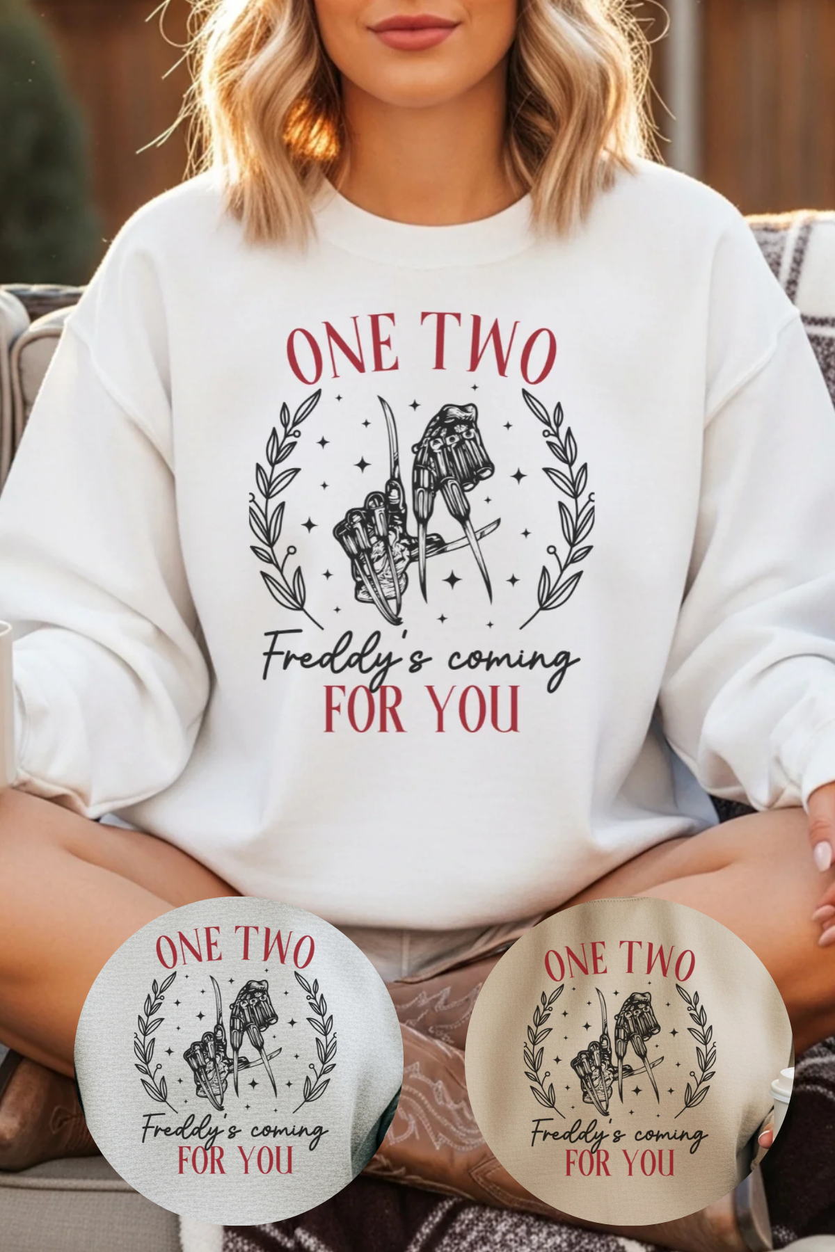 Get ready for spooky season with the Freddy's Coming Sweatshirt. Designed with a playful twist on classic horror vibes, it features a super soft inside that keeps you cozy while embracing your inner fan. Perfect for chilling out or making a fun statement, this sweatshirt blends comfort with eerie style.