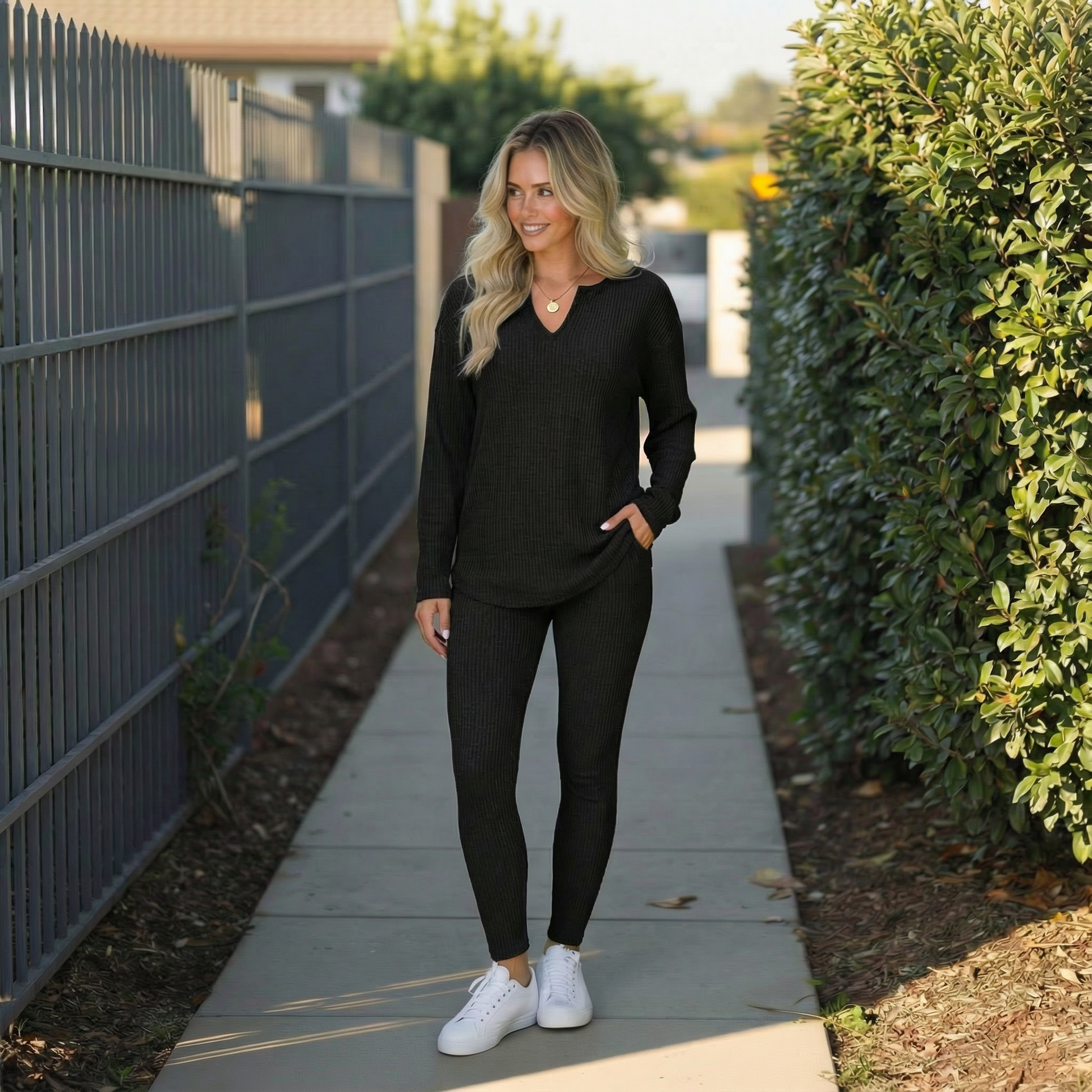 Travel days just got a whole lot easier. The Jet Set Comfort Ribbed Lounge Set is designed for women who want to look effortlessly put-together while staying insanely comfortable. Featuring a soft ribbed long-sleeve top with a flattering notch neckline and matching tapered pants, this set is your go-to for airport days, road trips, and cozy getaways.