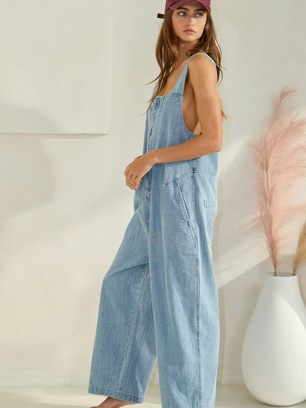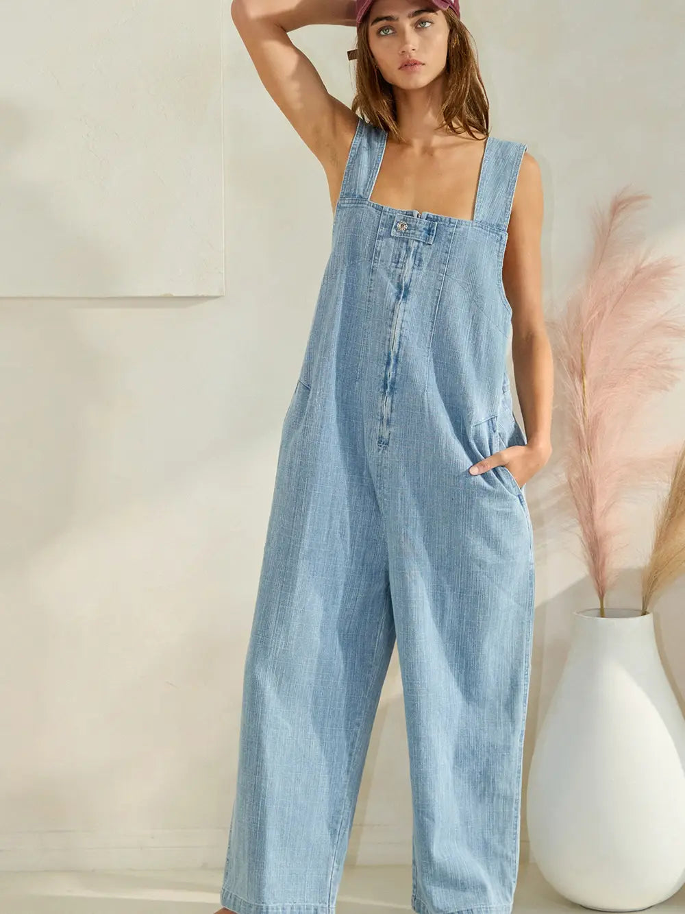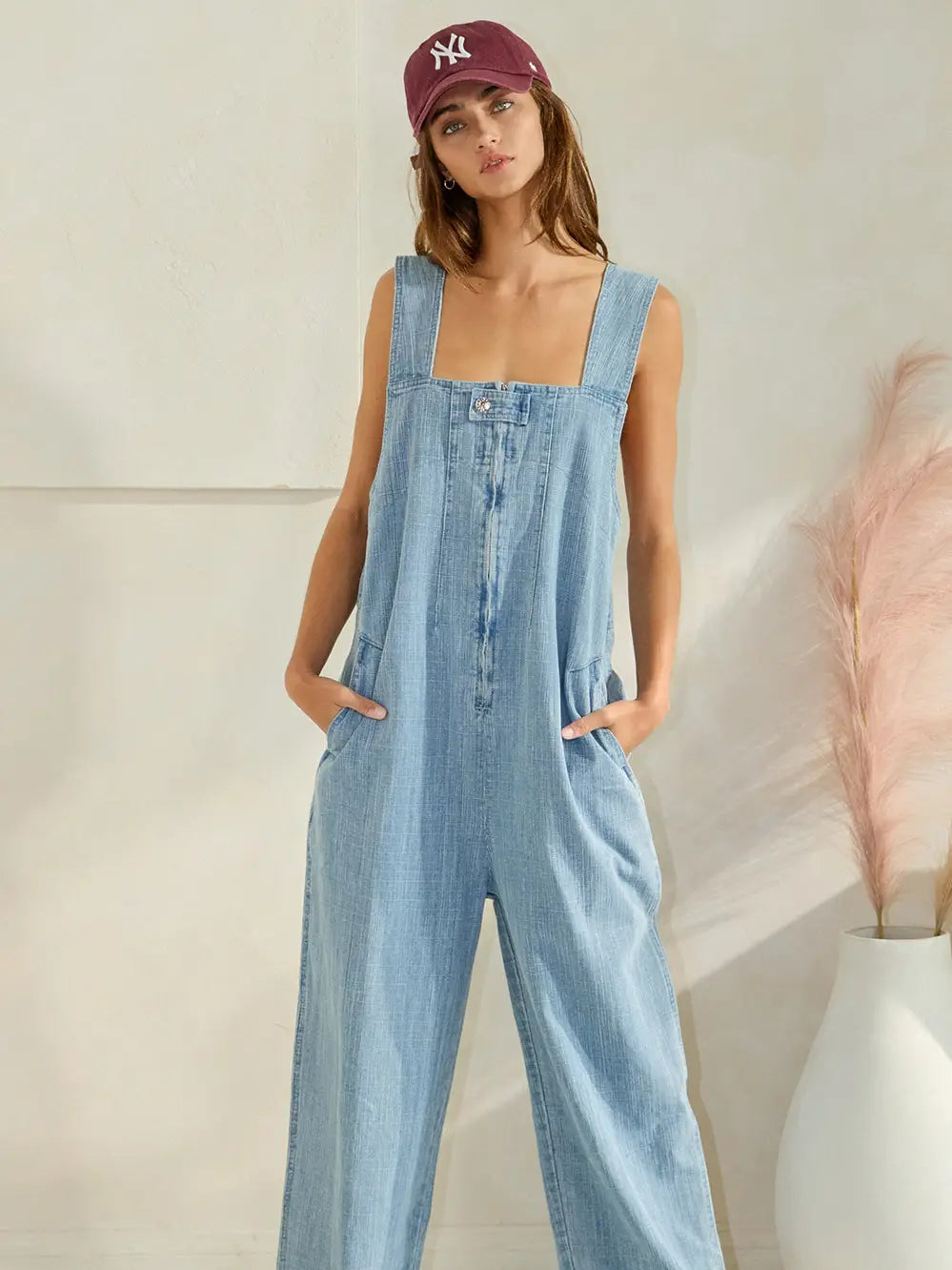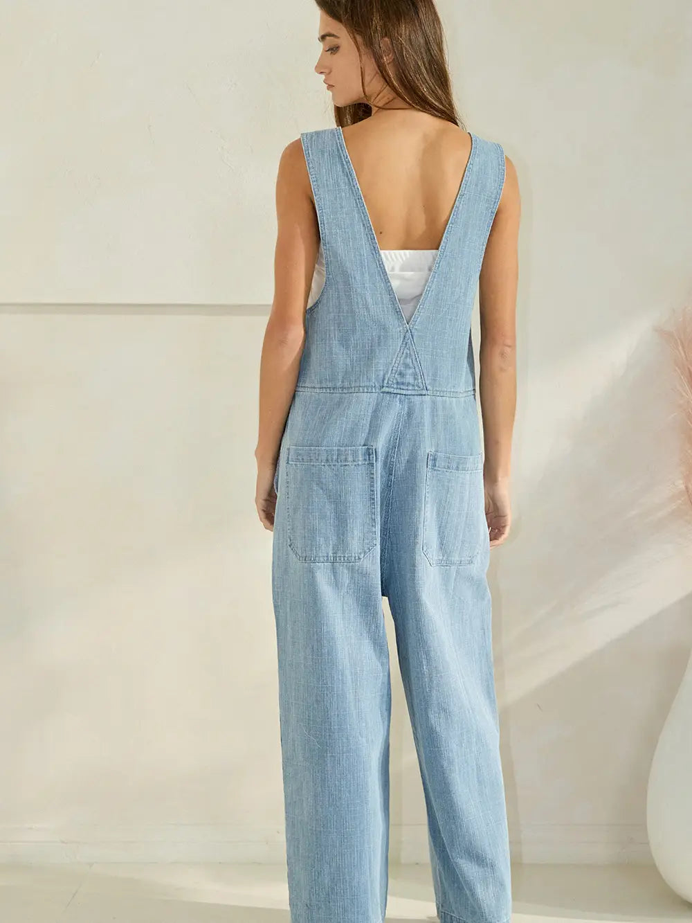 Zip-front Wide-leg Denim Overalls Jumpsuit - Square neckline - V-neck at back - Side pockets and patched pockets at back